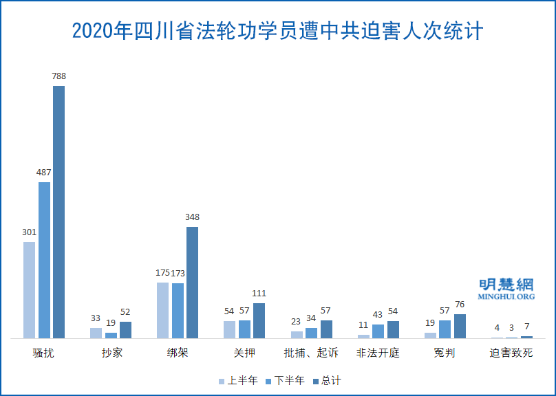 根据明慧网报道不完全统计,四川省二零二零年下半年骚扰:487人次,其中抄家19人;绑架173人,57人仍然非法关押,116人已回家,劫财186455(注:内江十多万元算十万元)34人被非法批捕、起诉;43人被非法开庭;57人遭诬判、五人维持原诬判,非法罚款397000元;三人被迫害致死;总计劫财583455元。