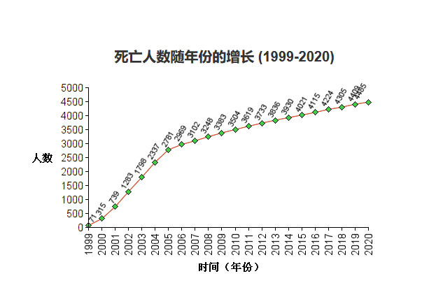 图1:1999年到2020年中国法轮功学员被迫害致死的统计表(明慧网)