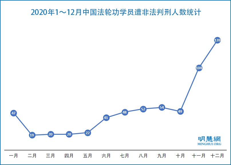 图2:2020年1~12月中国法轮功学员遭非法判刑人数统计。(明慧网)