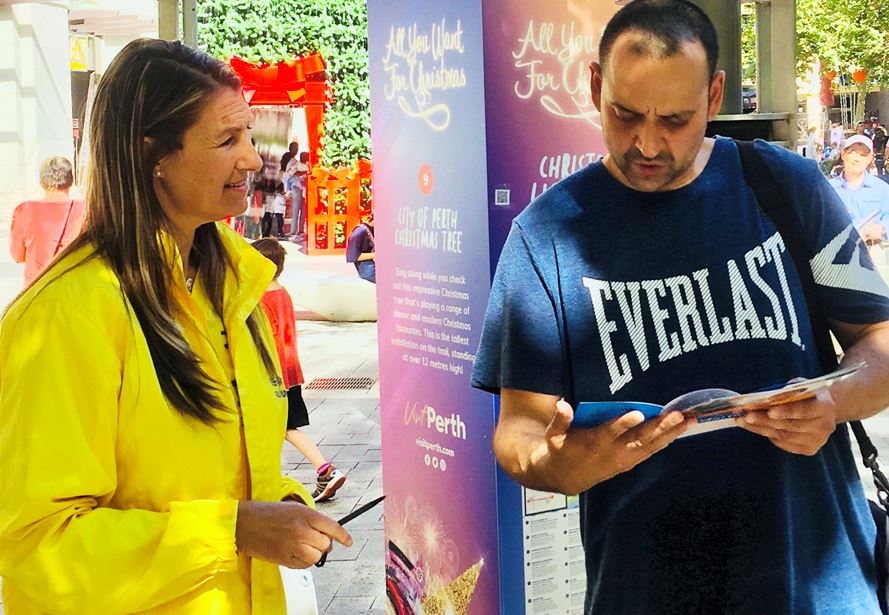 【明慧网二零二一年一月三十日】(明慧澳洲柏斯记者站报导)西澳法轮功学员们分别于二零二一年一月九日和二十三日,在澳洲西部首府柏斯市(Perth)的步行街默里街购物中心(Murray Street Mall)外传播真相,希望人们了解中共对法轮功学员长达二十一年的迫害,受到民众的支持和欢迎。他们主动传播法轮功真相,推崇真、善、忍价值。