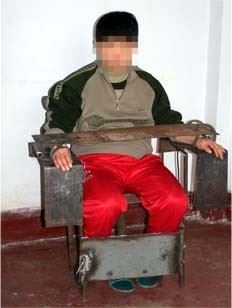 老虎凳有两种,一种是铁椅子,一种是木凳。马三家教养院将人固定在铁椅子上,上大锁。数九寒冬,被箍着的手、脚、腿都放在铁板上,有时他们还把铁板放在四面通风的铁窗下;有的法轮功学员的臀部坐烂了一个洞;有的手、脚浮肿,不能走路。有个学员身上没有穿棉衣,就这样在零下 27~28度的小号里关了22天。