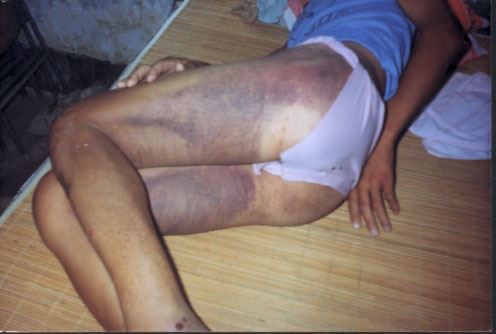 当要解绳子时,因为绳子已经勒到肉里,两只手肿的象大馒头一样,绳子解不开,只能连撕带拽,其痛苦可想而知。有的法轮功学员手被捆出了大泡,手背都烂了,往外流着脓。有个法轮功学员被捆绑了21个小时,松绑后全身动弹不了,队长还指使两个打手用脚踹,致使这位法轮功学员造成了残疾。并且两个多月不让洗漱、换内衣、来月经也不让换裤头,一直到下个月来月经,还穿着上个月的血裤头,全身腥臭难闻。有个被捆绑打坐18个小时的法轮功学员,放开后一点也动不了,一口鲜血从口腔喷出。