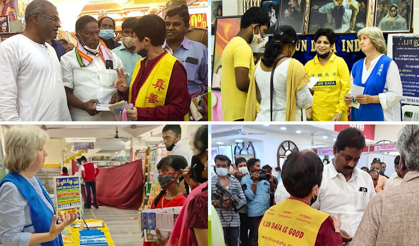 在书展的开幕式上,南部泰米尔纳德邦首席部长,和司法部以及地方政要们出席了会议,学员们向他们讲述二十一年来,修炼“真善忍”的法轮功学员们在中国大陆所遭受的无端关押迫害酷刑折磨,强迫做奴工,甚至被强行活摘器官的真相。并向他们讲述了“真善忍”是法轮功的修炼原则,是修心养善的高德大法。同时为他们推荐了法轮功书籍。