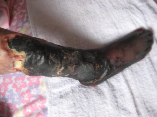 ![]() 宋会兰被打毒针迫害后,腿脚变黑、小腿腐烂(慎入)。 |