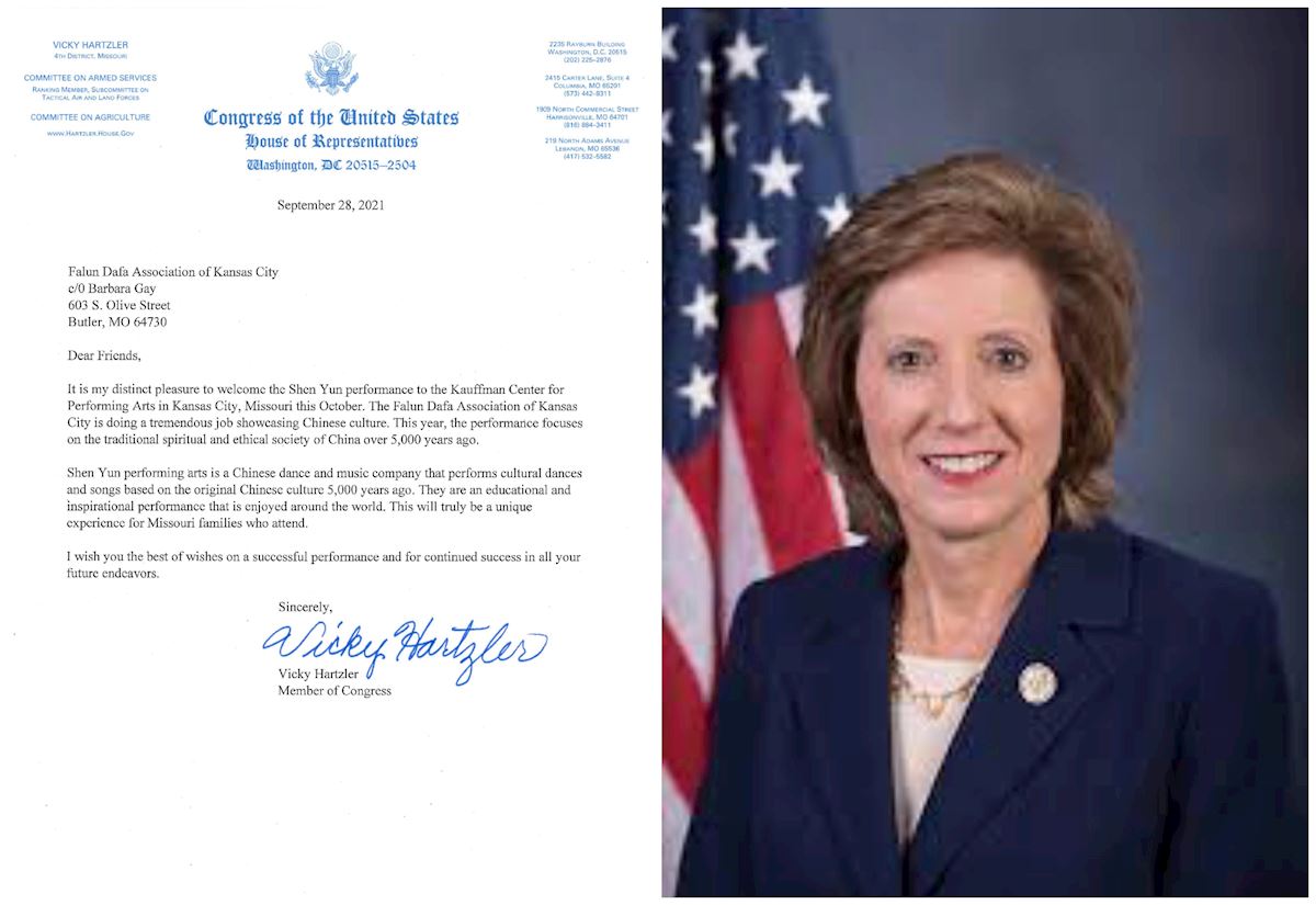 密苏里州共和党众议员薇琪·哈兹勒(Vicky Hartzler)是国会议员。她在贺信称赞演出主办方——堪萨斯城法轮大法学会“在展现中国文化方面做出巨大贡献”。
