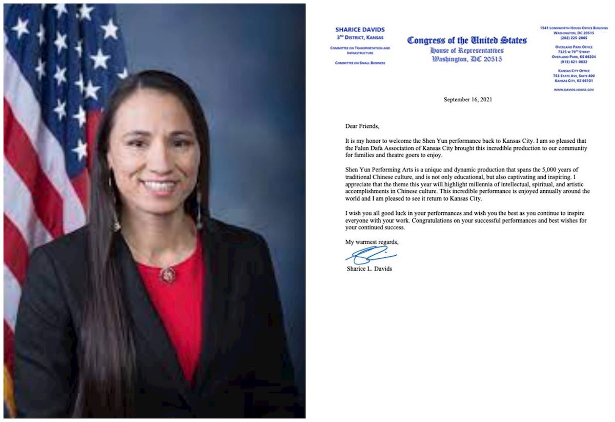 密苏里州众议员莎莉丝·戴维兹(Sharice Davids)在贺信中表示,“我很高兴堪萨斯城法轮大法学会将这台世界顶尖绝美的节目带到我们社区,让本市的家庭和剧场演出爱好者得以享受。”“神韵演出是独一无二且动态活泼的节目,跨越传统中华文化五千年,不只深具教育意涵,而且引人入胜、启迪人心。”她盛赞神韵的艺术成就,“今年的演出主题专注于中华文化数千年的智慧、精神与艺术成就,我深表欣赏。这台(神韵)神妙难诉的节目,每年都为全世界观众带来享受。”她祝愿神韵艺术家继续取得佳绩,与此同时,“也为以节目启迪世界大众的你们送上最好祝福”。