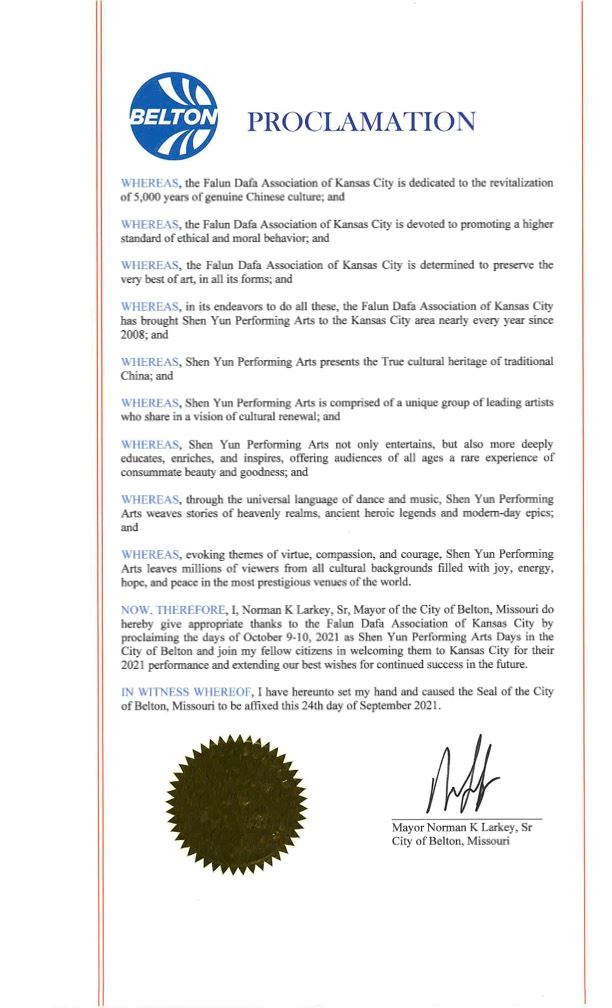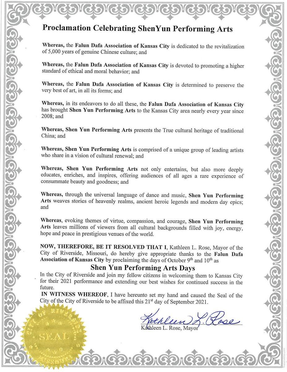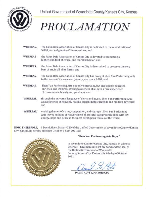 堪萨斯城(City of Kansas)、哈里森维尔(City of Harrisonville)、贝尔顿(City of Belton)和里弗赛德(Riverside)四市及堪萨斯州怀恩多特县(Wyandotte County)则先后发出褒奖令,宣布十月九、十日为当地“神韵演出日”,以嘉奖和感谢堪萨斯城法轮大法学会与神韵艺术家的卓越贡献。