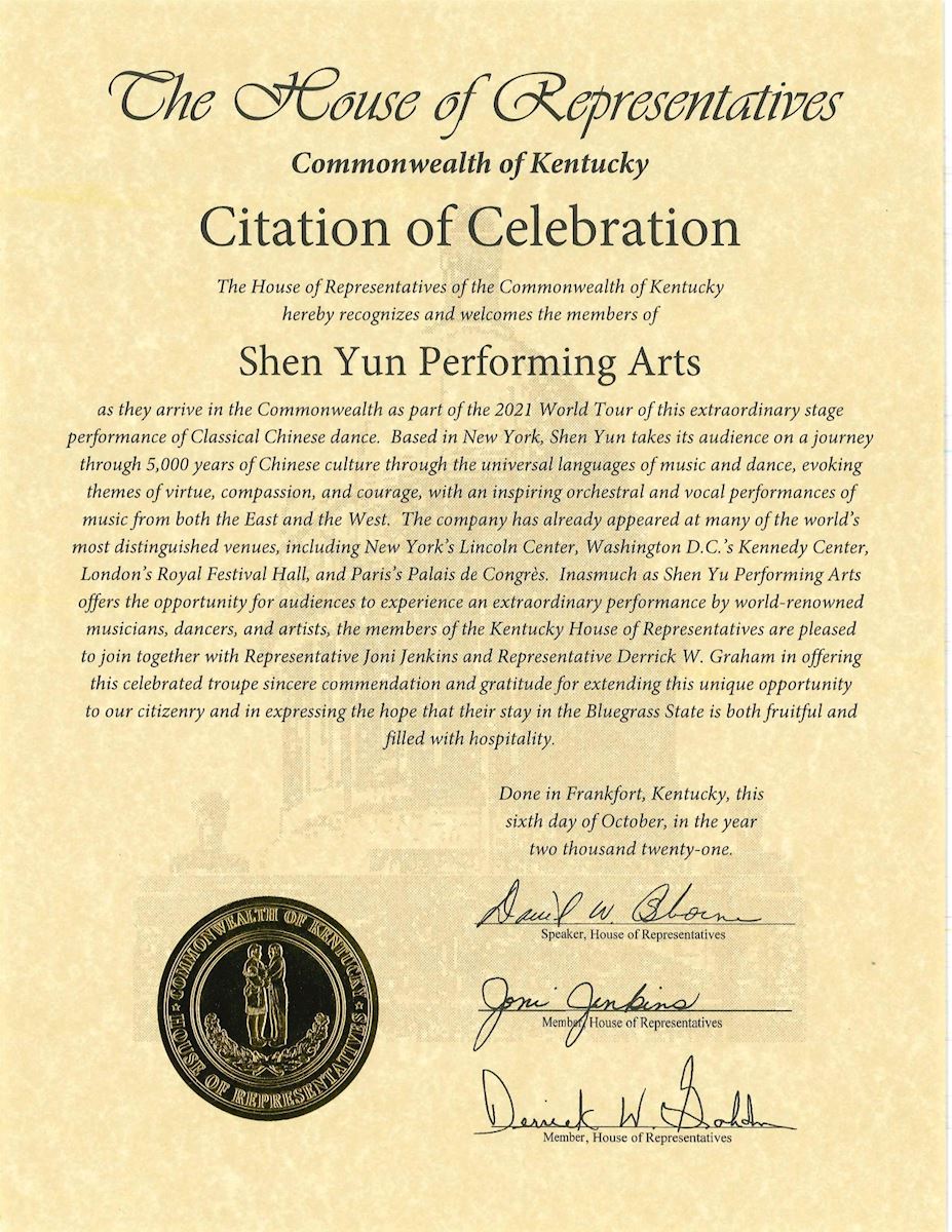 该嘉奖状中写道:“肯塔基州众议员们非常高兴能向赫赫有名的(神韵)艺术团发出这份充满诚意的嘉奖状,并表达谢意,感谢(神韵)为我们全体市民提供这个独特的机会;众议员们希望(神韵艺术家)在蓝草州(Bluegrass State)的短暂停留硕果累累,并能感受到民众的热情好客。”