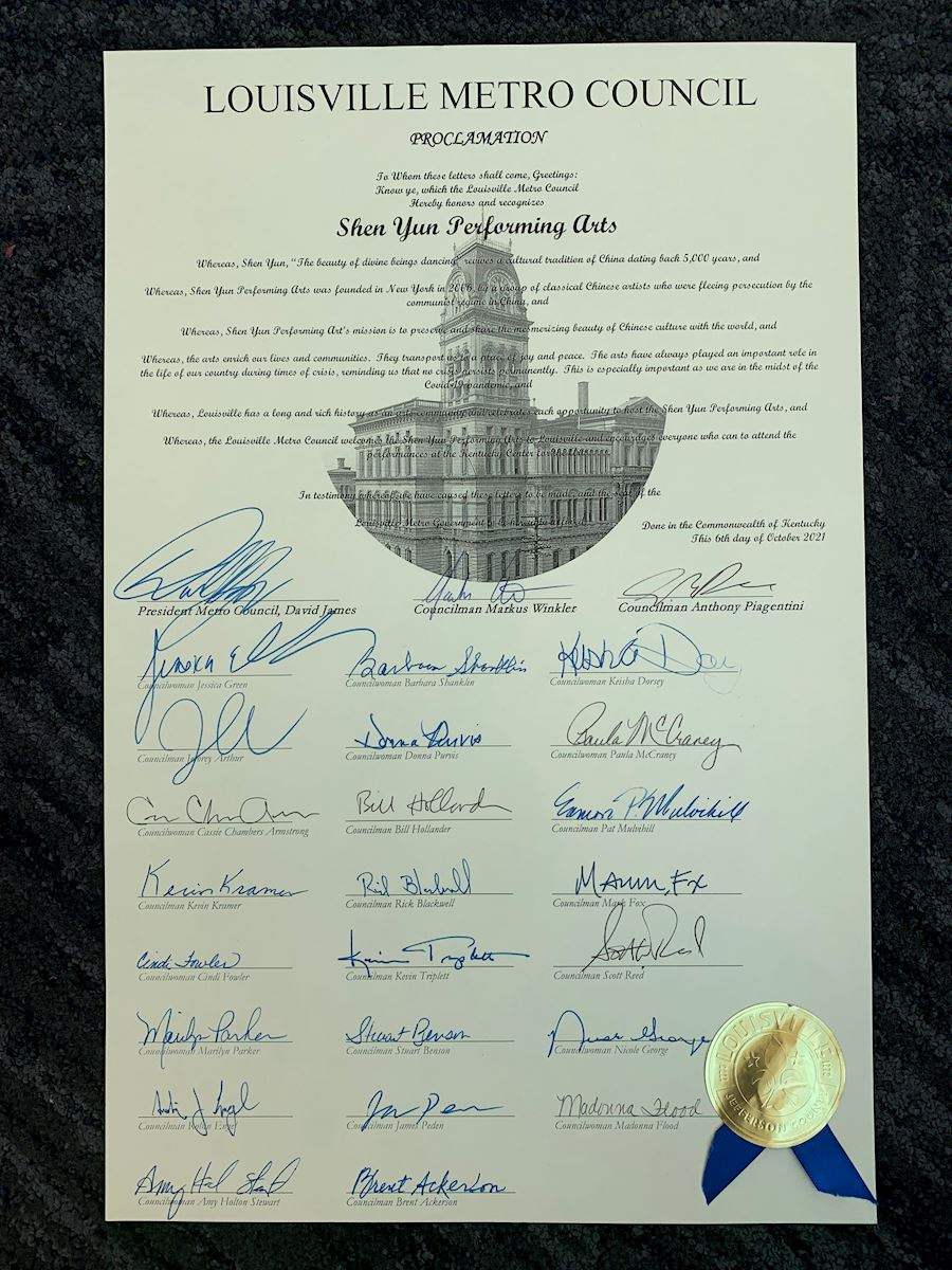 二零二一年十月九日,神韵巡回艺术团在肯塔基州最大城市路易维尔(Louisville)的肯塔基表演艺术中心(Kentucky Center)上演两场演出。在神韵抵达的前两天,肯塔基州众议院和路易维尔市议会;包括路易维尔市长在内多位政要在褒奖与贺信中向神韵表达感激之情。二十六名市议员则一致鼓励所有市民都尽可能去观赏神韵。