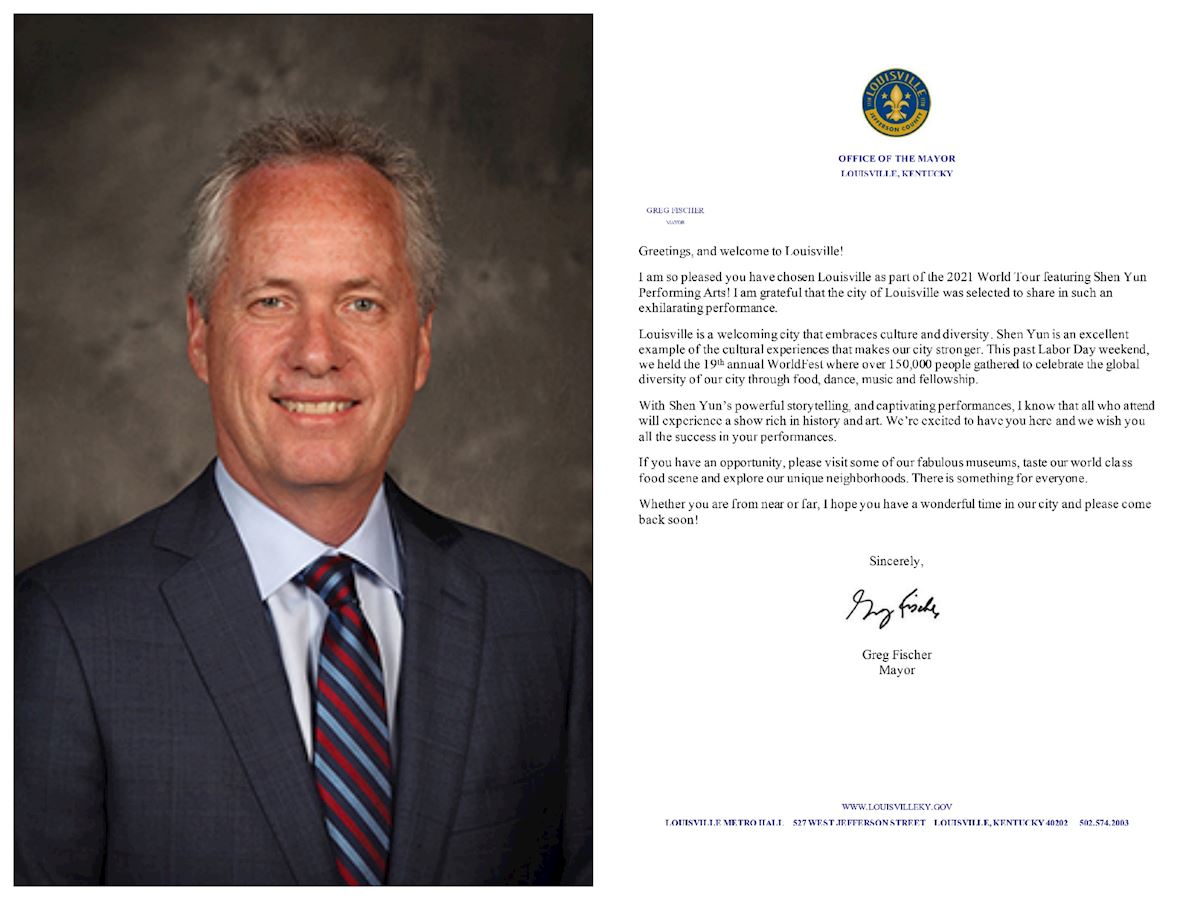 肯塔基州路易维尔市市长格雷格·菲舍尔(Greg Fischer)发出贺信恭贺神韵莅临路易维尔。贺信中写道:“我非常高兴路易维尔被选做神韵艺术团二零二一年世界巡回的其中一站!我非常感激路易维尔市被(神韵)选中,上演如此令人振奋的演出。”