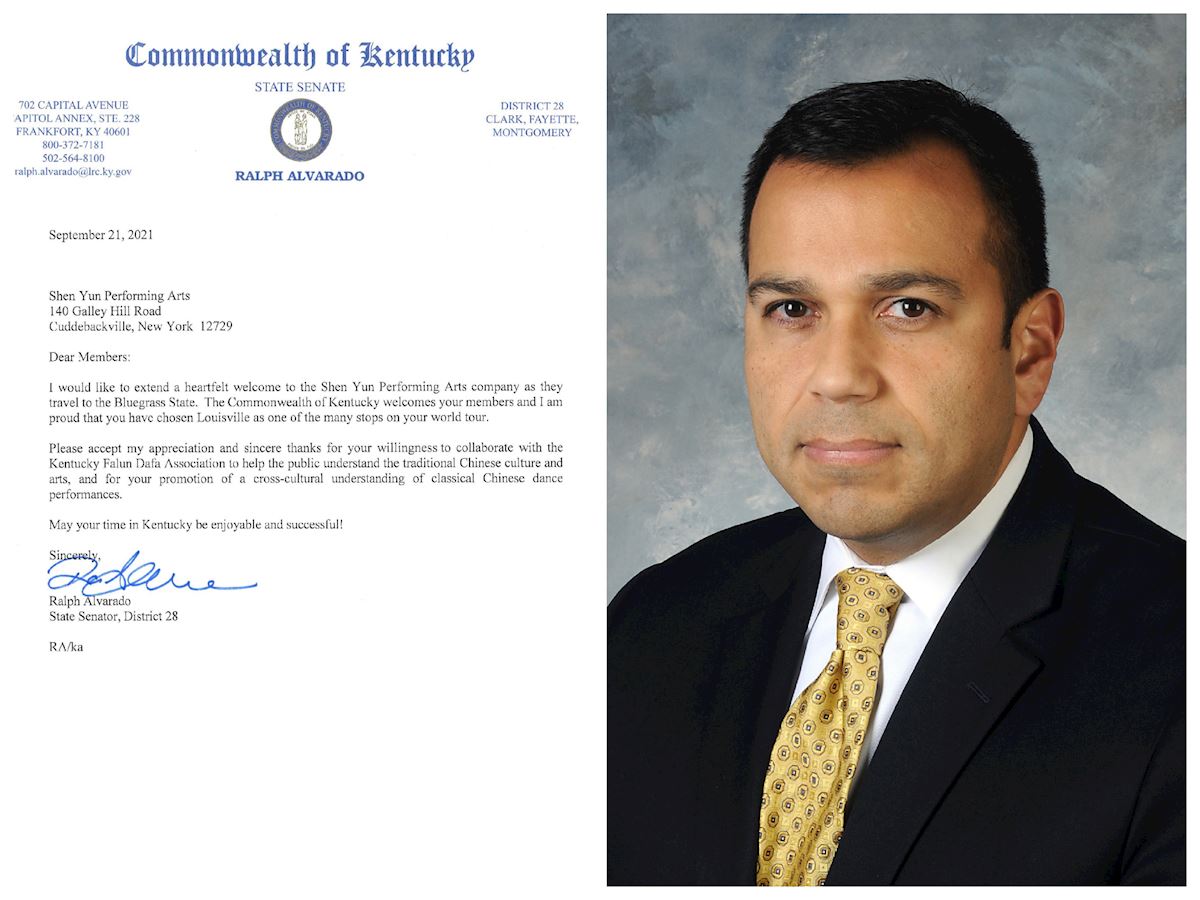 肯塔基州参议员拉尔夫·阿尔瓦拉多(Ralph Alvarado)在贺信中写道:“我非常高兴能向神韵艺术团表达我最衷心的欢迎。肯塔基州欢迎(神韵的)成员,你们(神韵)将路易维尔选为你们全球巡演的其中一站,让我倍感自豪。”他还写道:“请接受我的感激和由衷的感谢,谢谢你们志愿与肯塔基法轮大法学会一道,让民众了解传统的中国文化和艺术;谢谢你们推广这一跨越文化的传统中国舞蹈演出。”