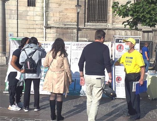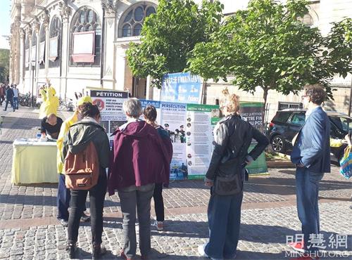 十月九日下午,秋高气爽,法轮功学员举办的真相日活动,在巴黎最大的地铁站夏特蕾站门前广场进行,这里人潮如流。人们有的停下脚步,接受法轮功传单和真相报,有的观看法轮功学员炼功,有的人阅读展板,提出问题。巴黎民众了解到法轮功学员仅仅因为修炼真、善、忍就遭到中共迫害,甚至被强摘器官,都感到震惊、愤慨,纷纷在征签表上签字,希望制止中共暴行。人们纷纷赞扬法轮功学员不畏强暴的勇气和坚持,希望法轮功学员早日获得自由和平的修炼环境。