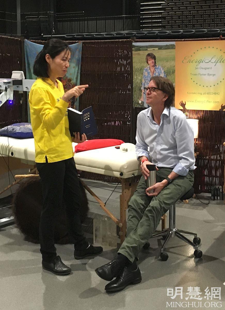 两位女士决定要学炼法轮功,买了丹麦文的《法轮功》和《转法轮》,留下自己的通讯方式,“我们留下邮箱了,你们组织教功的时候,一定要给我们信息呀。”她们内心的喜悦挂在脸上。
