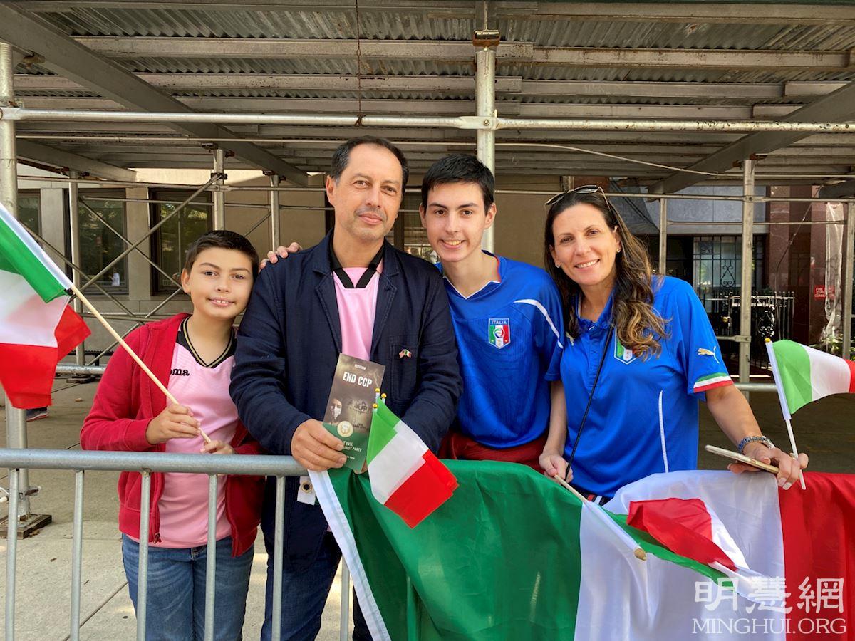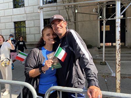 游行中,众人挥舞着意大利国旗,数十辆花车和乐队、上百个团体从第五大道上的四十四街游行到七十二街。法轮功学员的天国乐团、旗阵、法轮功功法展示与腰鼓队,在游行队伍中,非常亮眼。法轮功学员的演奏,鼓乐声声都传递着真、善、忍的信息,给观众留下深刻印象。观众纷纷表示法轮功队伍独特出众,非常棒,他们很喜欢。