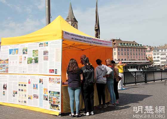 九月二十五日,在苏黎世的利马特河畔,法轮功学员展出十二幅真相展板和大型横幅向路人详细地介绍法轮功,揭露中共的血腥迫害。