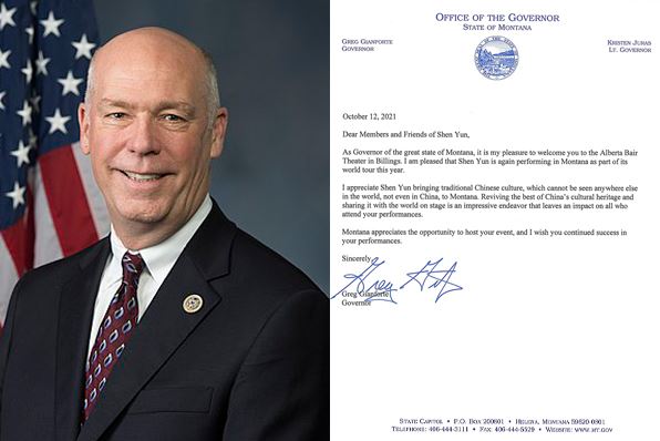 ![]() 图2:神韵艺术团在演出前夕,收到来自蒙大拿州州长格雷格·詹福特 (Greg Gianforte) 的贺信。他在信中祝神韵艺术团继续取得成功。 |
