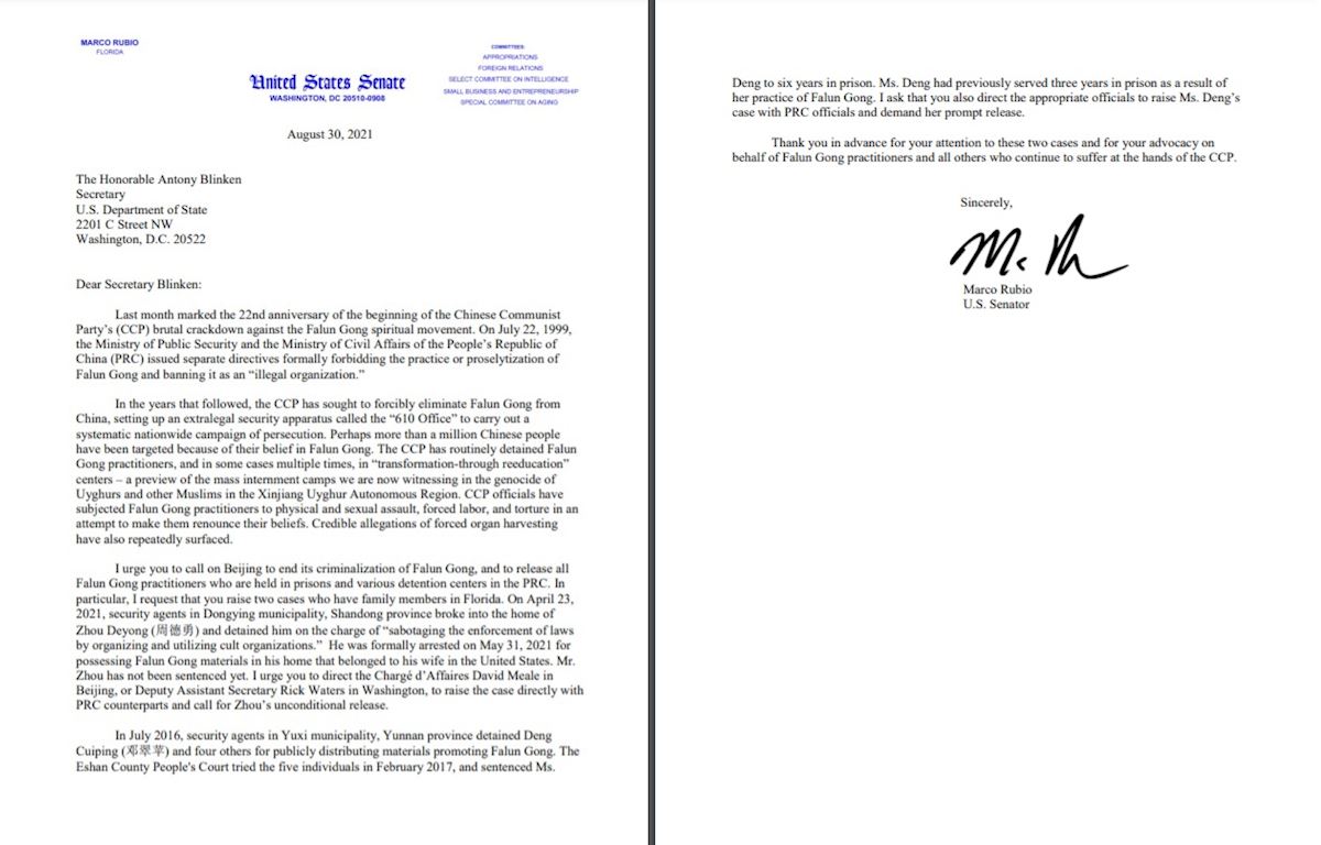 '图2:联邦参议员卢比奥(Senator Marco Rubio)致信国务卿布林肯(Antony Blinken),敦促国务卿呼吁中共释放所有法轮功学员。图为信件原文。'