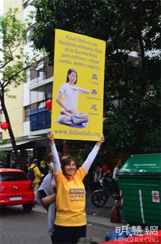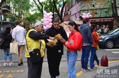 弘法中,不时有观看的人要求学功,学员们边轮换安排小组教他们功法。一位学员表示,很多人手拿着传单一遍遍地说谢谢,有的人把传单贴着胸前,很是感人。
