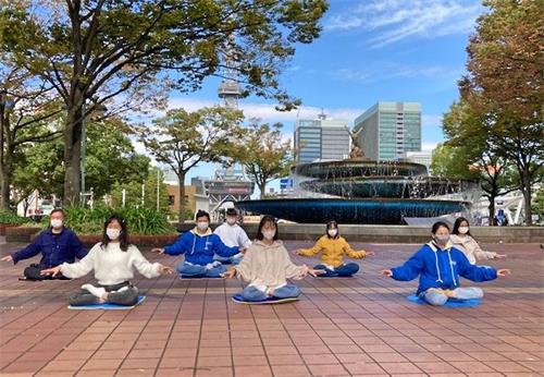 '图1~2:二零二一年十月二十四日(星期日),日本中部地区法轮功学员在名古屋市(Nagoya-City)最繁华地段——荣(Sakae)的喷水附近集体炼功,向过往行人传播法轮功的真相。'