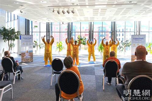 '图1~3:二零二一年九月二十三日至二十六日,第三十六届瑞典哥德堡书展期间,每天下午,当地法轮功学员应邀展示法轮功五套功法。'