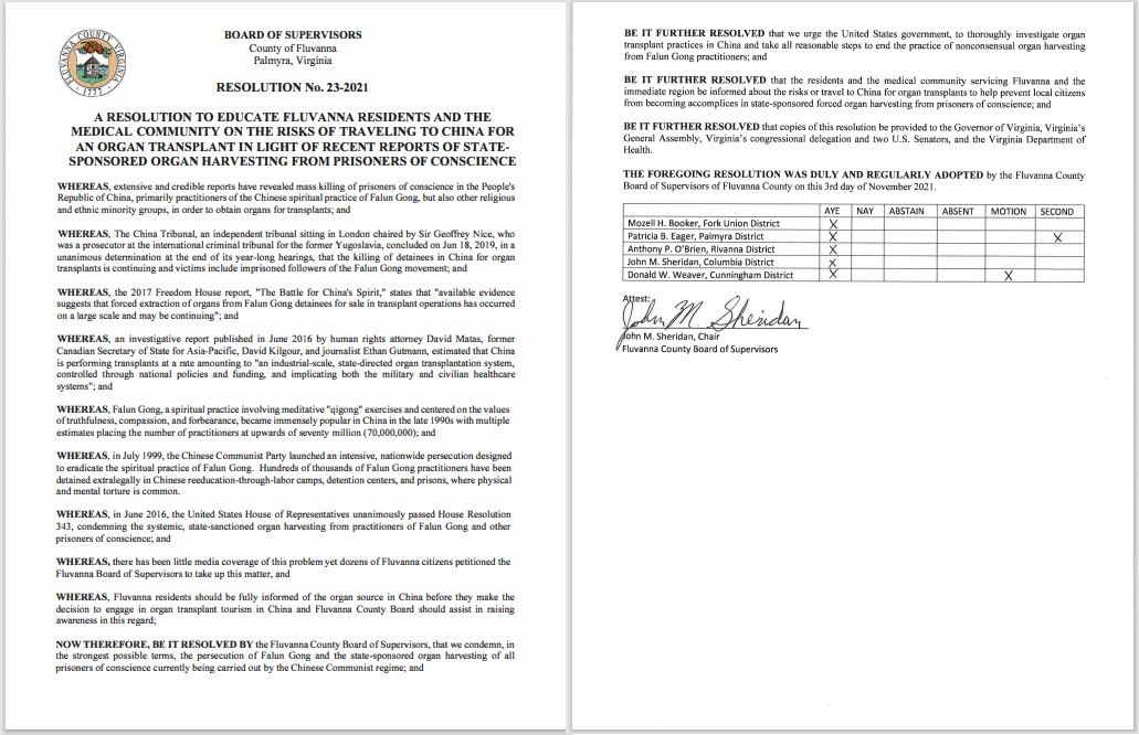 【明慧网二零二一年十一月十二日】二零二一年十一月三日,美国弗吉尼亚州中部的弗卢万纳郡(Fluvanna County)郡议会全票通过决议案,强烈谴责中共对法轮功学员的迫害和活摘器官的罪恶,同时提醒当地民众,如果前往中国去进行器官移植手术,无意中很可能就在杀害一个无辜的生命。