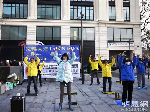 ![]() 图6:二零二一年十一月六日,在夏特蕾地铁站外,法轮功学员演示功法。 |