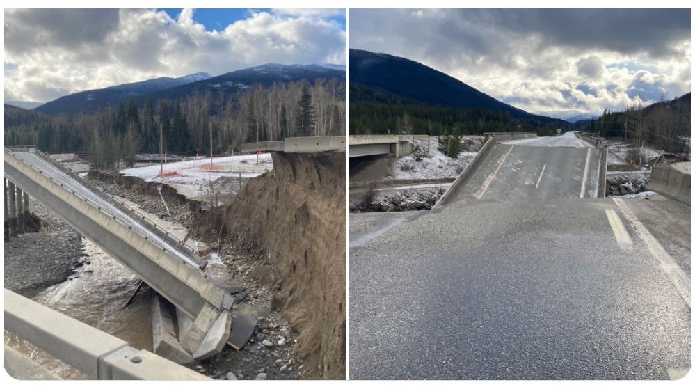 图1:2021年11月18日,加拿大卑诗交通部门在社交媒体上发布的图片,显示泥石流冲毁了该省5号公路202号出口(Exit 202)附近的路段。