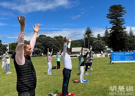 十一月二十一日,奥克兰法轮功学员在市中心以及两个区的海边公园集体炼功,祥和的音乐加上优美舒展的五套功法,让人们驻足观望。