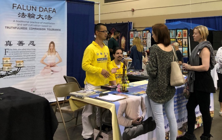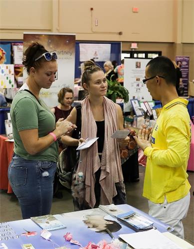 有一对母女和法轮功学员交谈良久,俩人都觉得法轮大法展台的能量是整个会场最好的。还有一位年轻小伙子,当学员跟他讲起中共对法轮功修炼者长达二十多年的迫害时,他难过极了,但他尽量克制自己不让眼泪夺眶而出。他仔细询问有哪些途径他可以帮助制止这骇人的迫害,拿取了邮寄给国会议员呼吁制止中共活摘器官与贩卖的明信片,临走前他还特意多带一份材料给他高龄的奶奶,说奶奶一定也会想要帮忙制止这场残酷的迫害的。