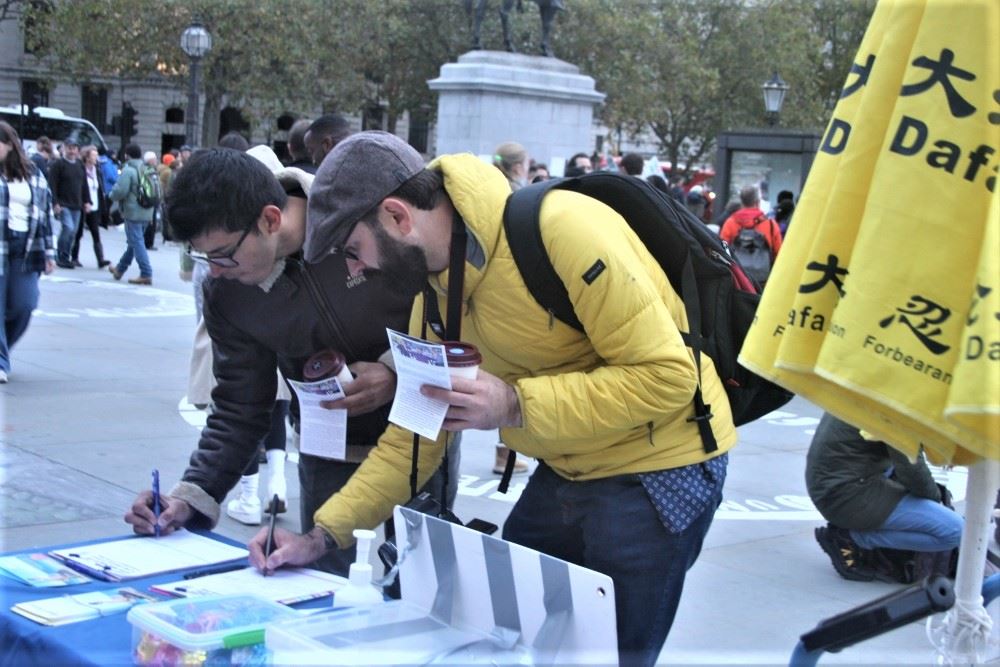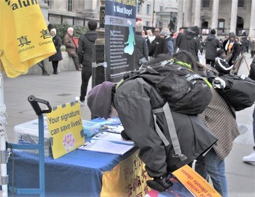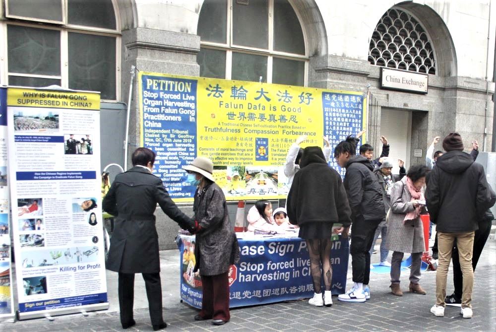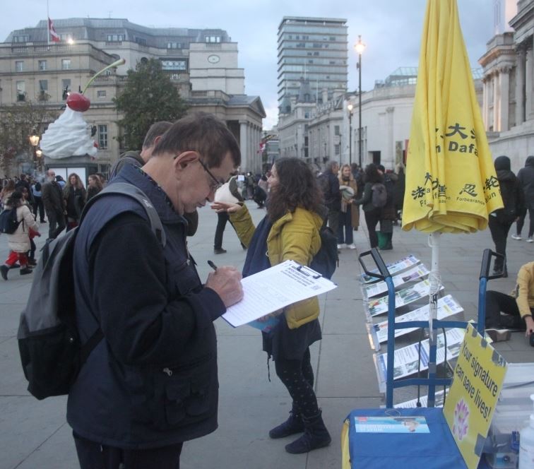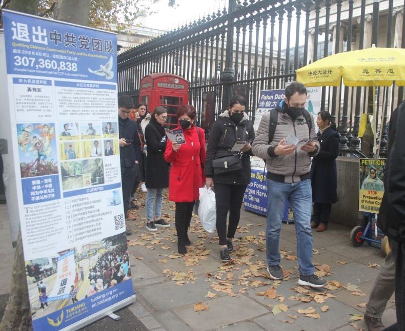 【明慧网二零二一年十一月二十九日】自从二零二一年七月封城限制全部打开之后,英国伦敦的法轮功学员又恢复了在大街上的弘法、讲真相的活动。每个周六周日的下午,在英国伦敦市中心,都有三组法轮功学员分别在中国城、大英博物馆外、鸽子广场或者圣马丁广场讲真相,揭露中共迫害。很多人在了解了真相后,非常愿意接受真相传单并来签名反迫害。
