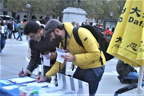 约翰·斯多克斯在请愿表上签了他的名字,然后对一位法轮功学员说:“全世界都被感染了,但一般来说,我不认为现在世界上对正在发生的这个事情有充分的了解,几乎就象是对病毒的了解,有多少人知道这种种族灭绝正在发生,不是很多,只有你们站在这里,告诉我们正在发生什么。相比于人权,人们更关心金钱和生意,这才是问题。归根结底,是人性的贪婪。但任何的强权都不会长久的。谢谢你们,我下周还会来。”