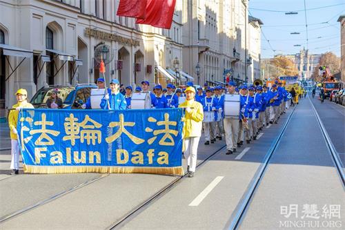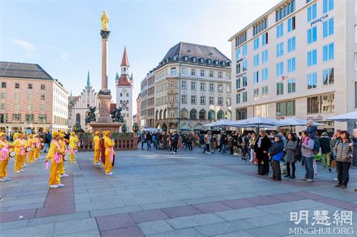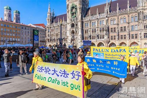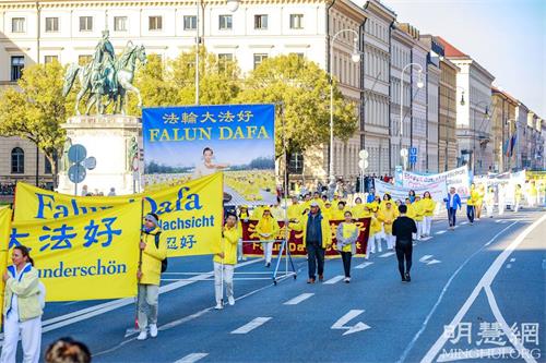 集会后,法轮功学员从玛丽亚广场出发,途经著名的谷物市场(Viktualienmarkt)、塔尔大街(Tal)、著名奢侈品街马克西米利安大街(Maximilianstraße)、国家剧院、慕尼黑王宫和奥迪安广场(Odeonsplatz),最后回到玛丽亚广场。所到之处,人们熙熙攘攘,大家竞相观看法轮功学员的游行队伍,有的人拿到资料马上仔细观看,有的人伸出大拇指,沿途很多人签名声援法轮功学员反迫害。
