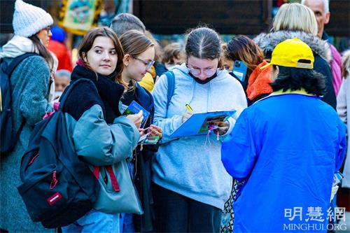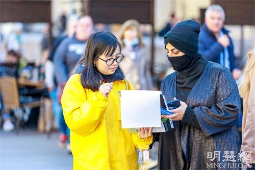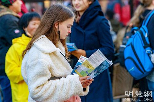 民族学大学生间舞蹈演员普里布克女士(Leonie Priebke),觉得法轮功学员游行队伍“非常亮丽,多姿多彩,也很平和。”她听一位学员讲述了真相并签了名。“当一个政权禁止以和平为导向的组织,因为它感到了威胁,这简直是对人权非常严重的干涉。”