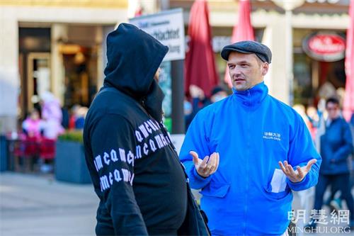 银行职员德克斯岱讷(Norbert Decksteiner)在玛利亚广场签名声援法轮功学员反迫害,“这里展示的一切,让人们必须来签名,如果发生了这种事,就得制止。每个人都必须尽到自己的责任。”