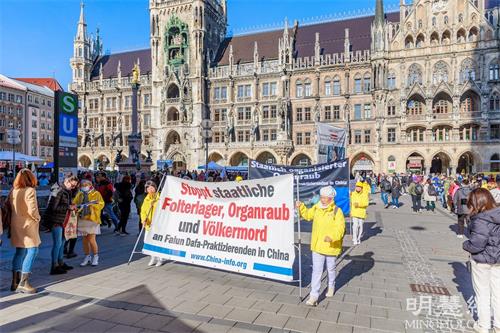 慕尼黑是德国巴伐利亚州的首府,德国第三大城市,也是德国文化、经济、政治和新闻中心。当天,慕尼黑内城挤满了人。在市政厅前的玛丽安广场(Marienplatz)上,“法轮大法好”、“真善忍”、“停止迫害法轮功”、“中共活摘法轮功学员器官”等大型横幅十分醒目。欧洲天国乐团、德国腰鼓队和来自波兰和捷克的舞龙队应邀参加了活动,他们的表演吸引了大量民众的目光。