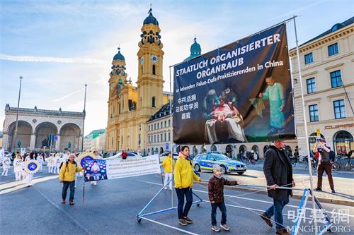 图1:二零二一年十月二十九日,法轮功学员在德国慕尼黑举办大型集会和游行,展示法轮功的美好,揭露中共迫害和活体摘取法轮功学员的罪恶。图为游行队伍从玛利亚广场(Marienplatz)出发。