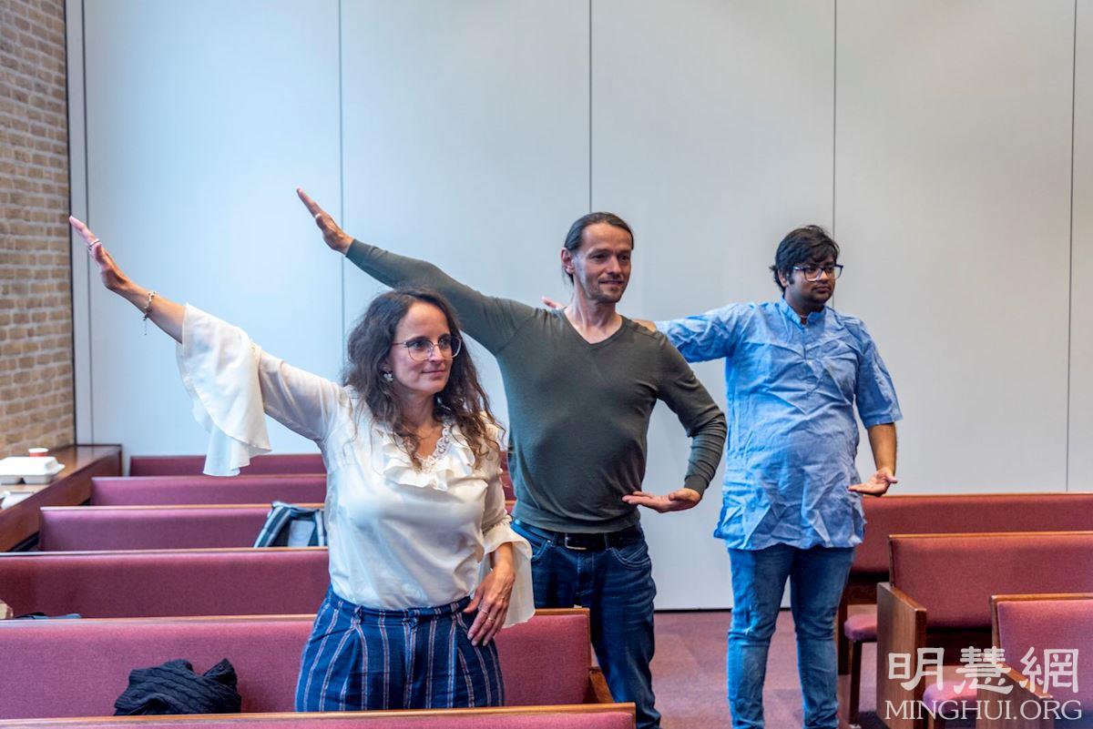 荷兰法轮功学员参加了此次研讨会,在会上讲述了中共剥夺法轮功学员的信仰自由、酷刑折磨甚至活摘他们的器官的情况。他们还向与会者介绍法轮功是以真、善、忍为修炼原则,加上五套功法的原理;并现场教大家试着体验法轮功的功法。