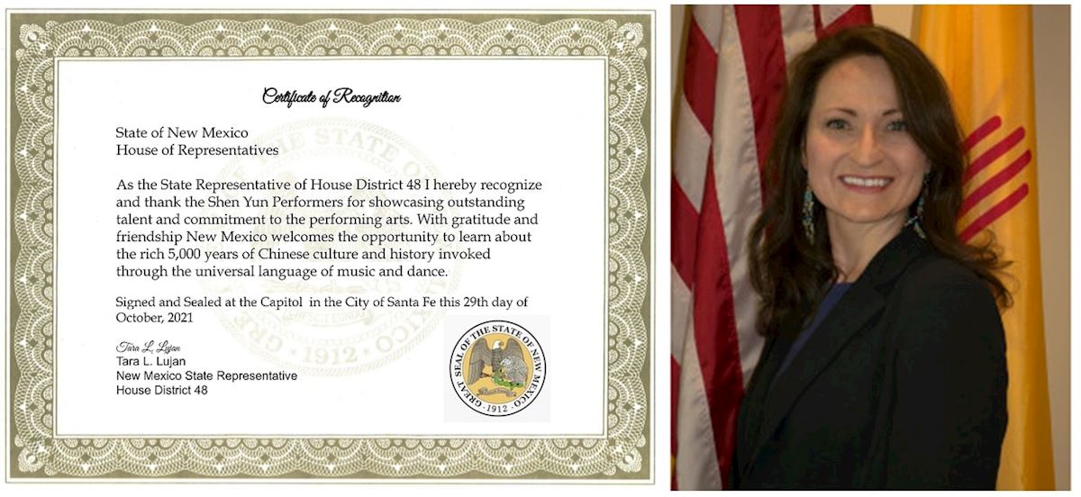 十月二十九日,新墨西哥州民主党众议员塔拉・鲁扬(Tara L.Lujan)女士签发褒奖令,感谢神韵为该州民众带来了解璀璨中华传统文化的机会。她写道: