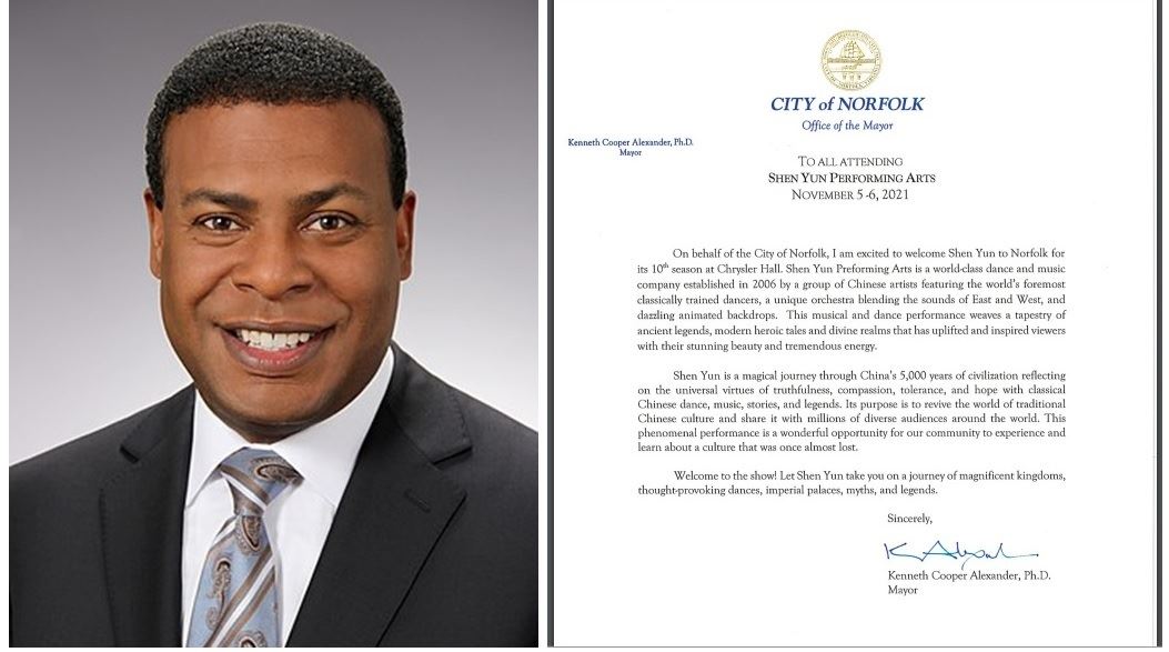 二零二一年十一月五日至六日,美国神韵艺术团第十次莅临弗吉尼亚州诺福克市(City of Norfolk)。诺福克市长肯尼斯・库珀・亚历山大博士(Dr Kenneth Cooper Alexander)在演出前发来贺信,恭贺神韵艺术团的到来。