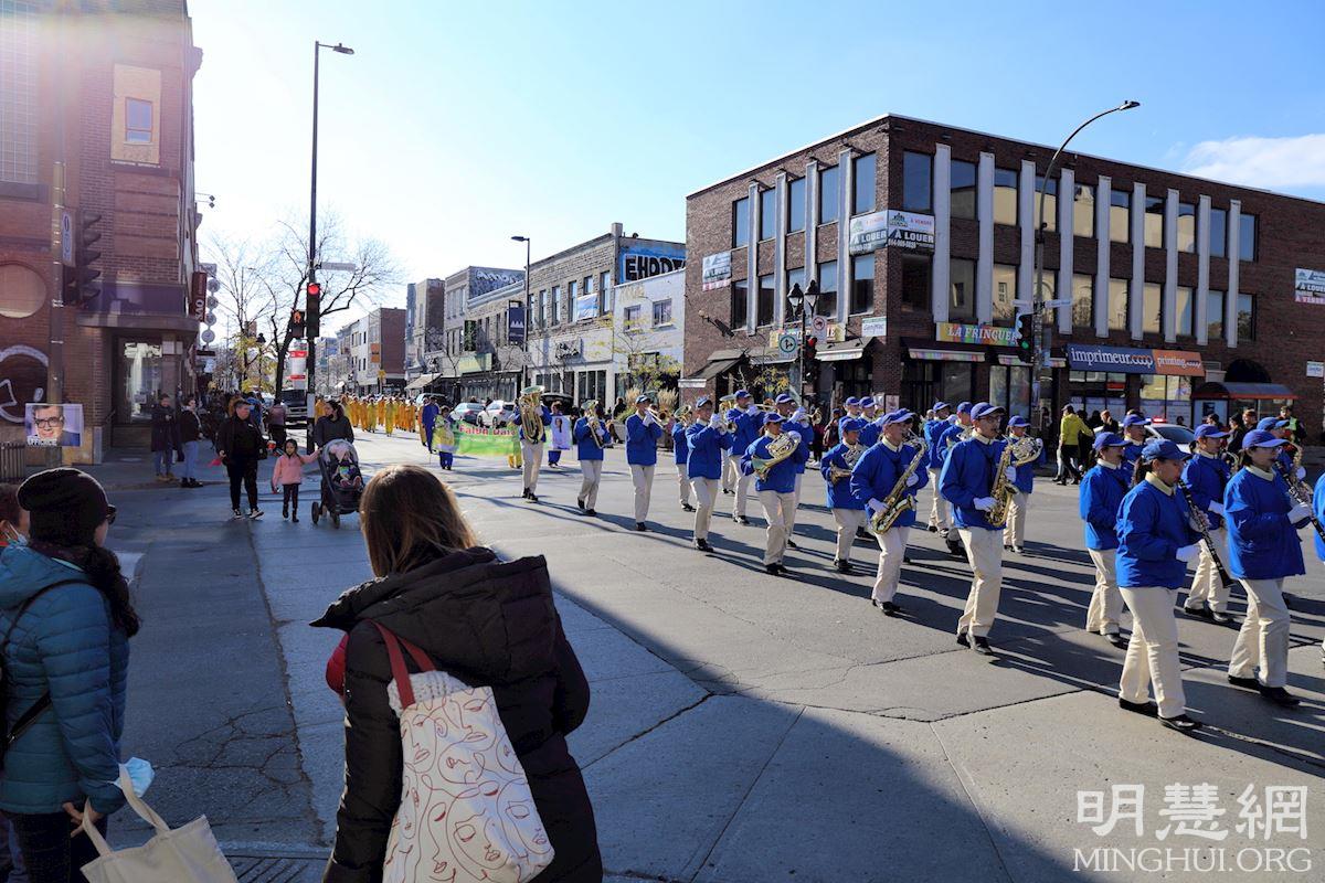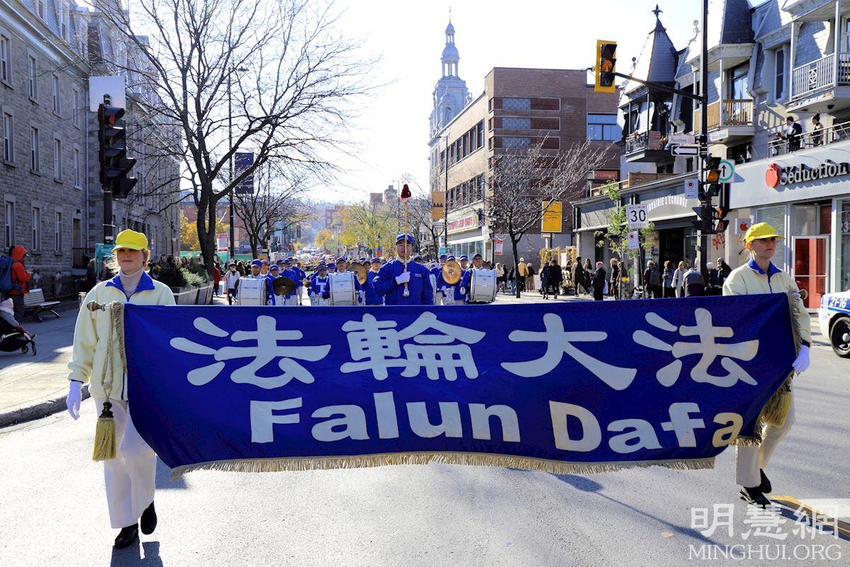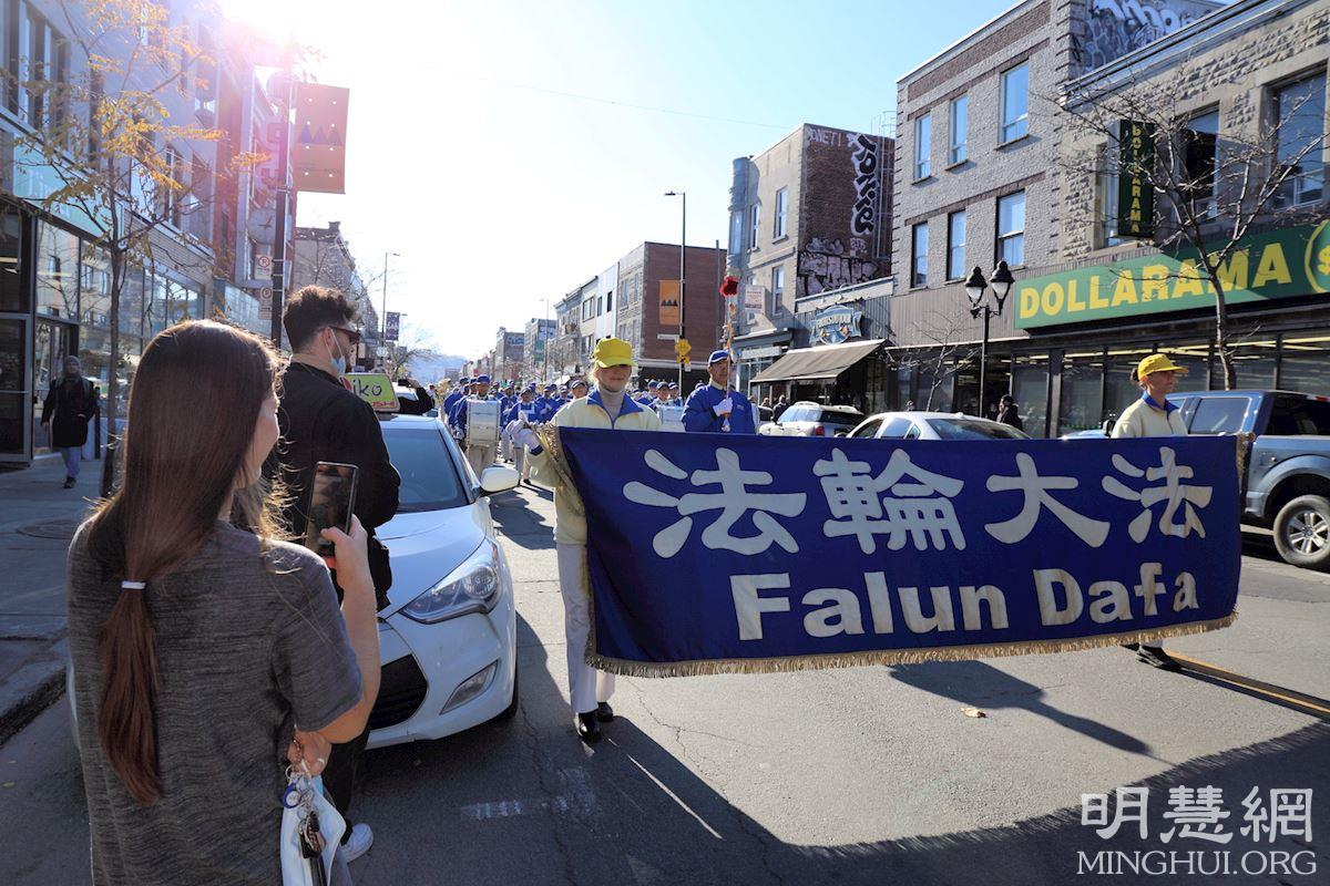 当日秋阳和煦,下午一点,游行队伍从皇家山大道(Av Mont-Royal)西端向东行进,这是蒙特利尔最主要的商业街之一。在两公里长的路途中,道路两旁的观众以鼓掌、竖大拇指、鸣笛等方式,向法轮功学员表达支持。