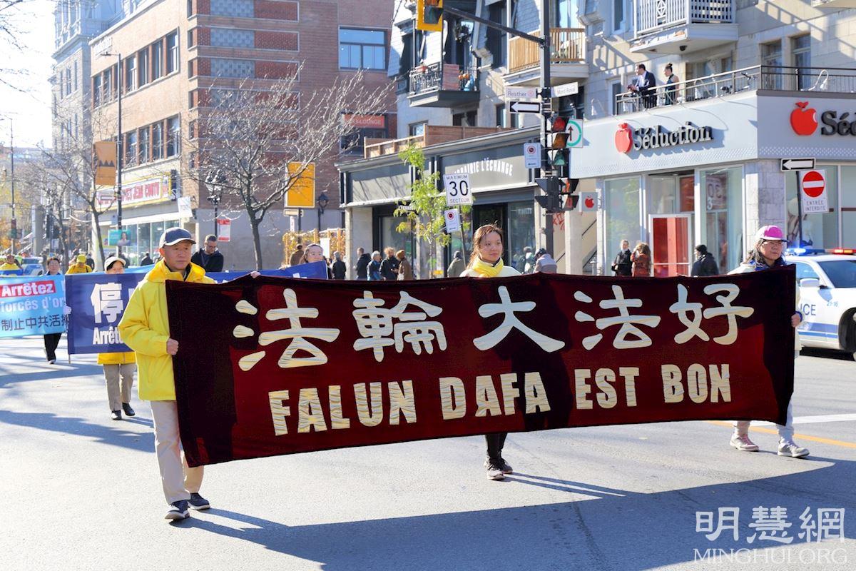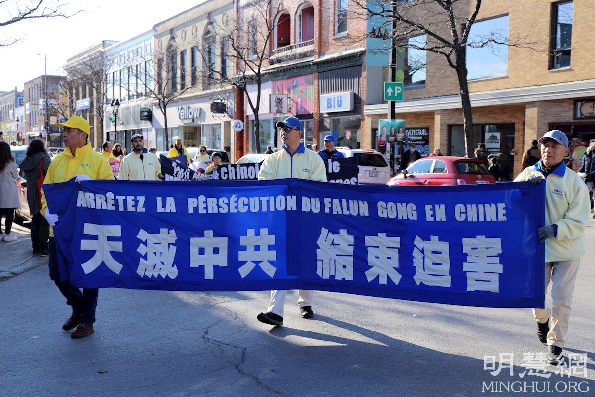 ![]() 图1:2021年11月6日,魁北克部份法轮功学员在蒙特利尔最主要商业街之一的皇家山大道(Av Mont-Royal)上举行反迫害游行。 |