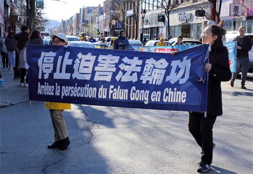 '图1:2021年11月6日,魁北克部份法轮功学员在蒙特利尔最主要商业街之一的皇家山大道(Av Mont-Royal)上举行反迫害大游行。'