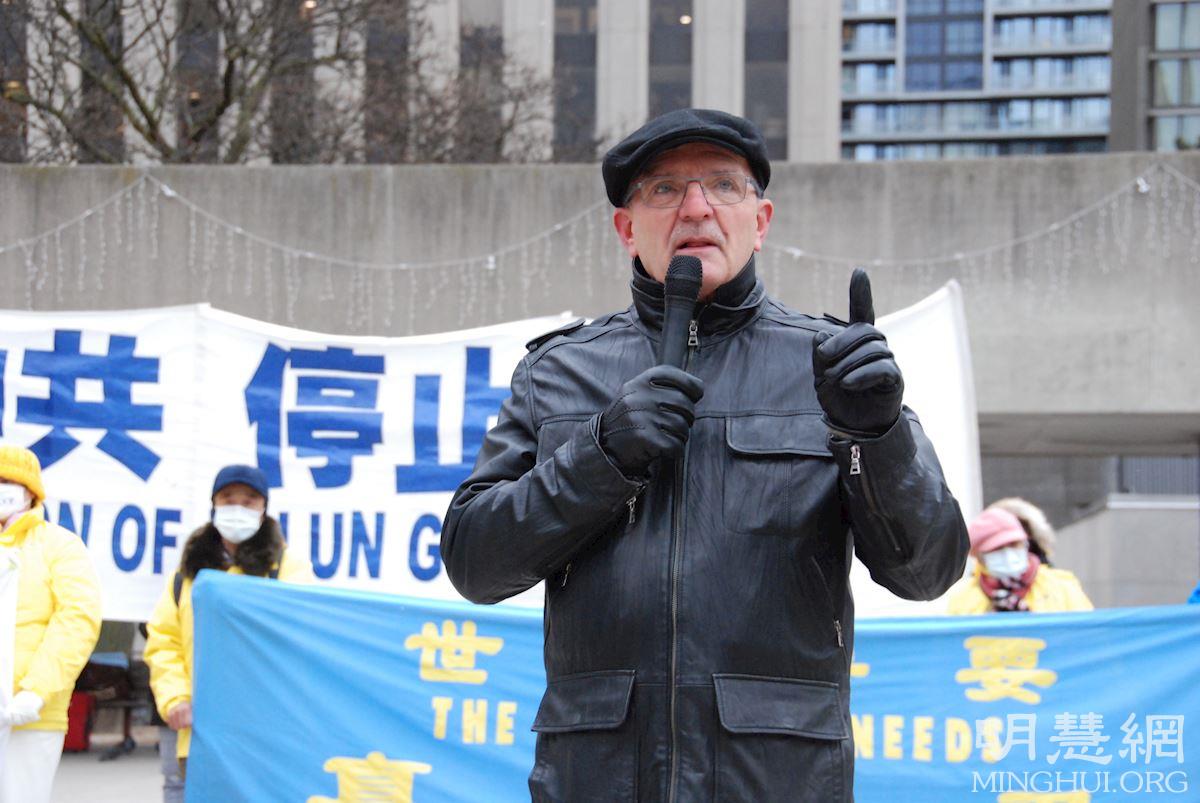 加拿大前参议员迪尼诺(Con Di Nino)在发言中说:“我们必须向中共发出我们的坚决的声音,对人权的侵犯是不可接受的行为。这么多年以来,中共似乎没有听从世界的意见。我在这里支持我的法轮功朋友、支持全世界的民主。”