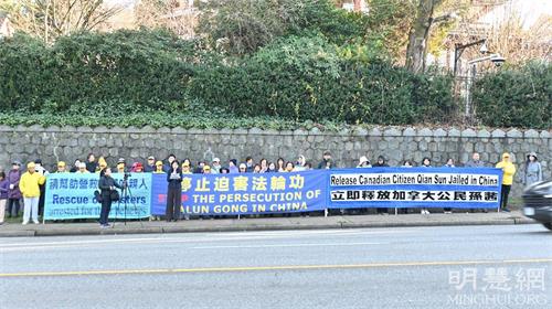 温哥华法轮大法协会发言人张素在集会上宣读了加拿大法轮大法协会的《公告》,《公告》敦促加拿大政府要求中共:“释放因对法轮功的精神信仰而在中国大陆遭受暴力迫害的加拿大公民孙茜女士,以及所有正受迫害的加拿大人的家属。”