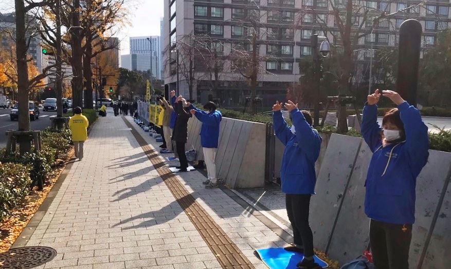 图1~2:法轮功学员在日本国会前的道路上演示功法