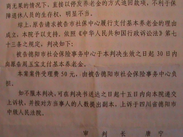 周玉宝依法维权,法院判赢了官司,但同时又说:根据《劳动和社会保障部办公厅关于退休人员被判刑后有关养老保险待遇问题的复函》、(劳社厅[2001]44号复函)、《四川省完善企业职工基本养老保险制度实施办法的实施细则》、(川劳社发[2006]18号)第六十七条的规定,退休人员被判处拘役,有期徒刑及以上刑罚或被劳教的,服刑或劳教期间,停发基本养老金。因此,原告在服刑期间违规领取的养老金应予退还,而德阳市人社局二零二一年十月补发了二零二零年八月起的退休工资,从二零二零年八月起只发给周玉宝扣除后的每月2660.01元。每月被非法扣除600多元,还要周玉宝退还三年服刑期间领取的工资121643元。