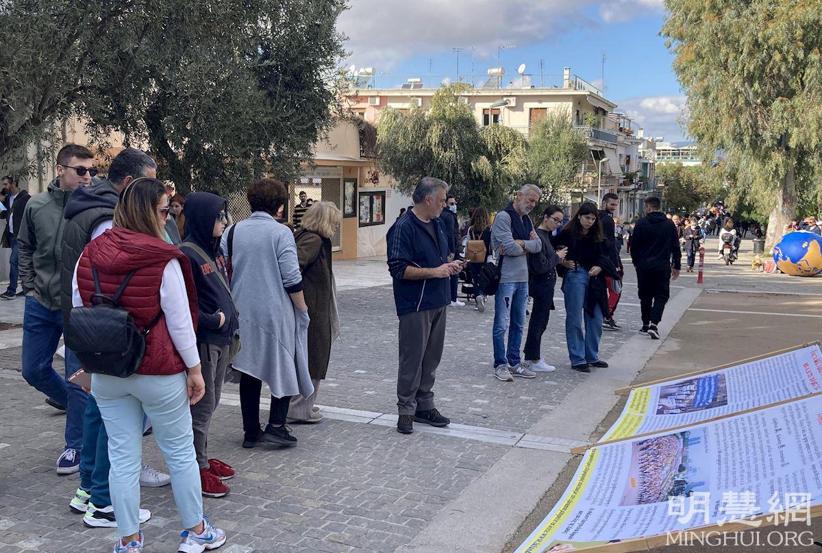 五日和十二日阳光明媚,卫城山下行人络绎不绝。法轮功祥和的音乐和舒缓的动作引来阵阵围观,有些人仔细阅读展板后还拿出手机拍摄。