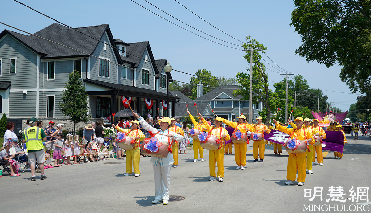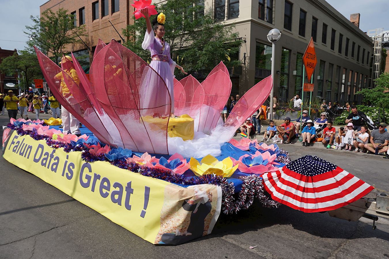 法轮功学员的队伍经过主席台时,主持人特蕾西·米克曼(Tracy Meekman)女士向观众介绍说,法轮大法的原则是真、善、忍,法轮大法是改善身心健康的修炼。她说,“他们(法轮功学员)的队伍色彩绚丽,他们还教导我们到底发生了什么。我们非常感激法轮功学员每年参加游行。”