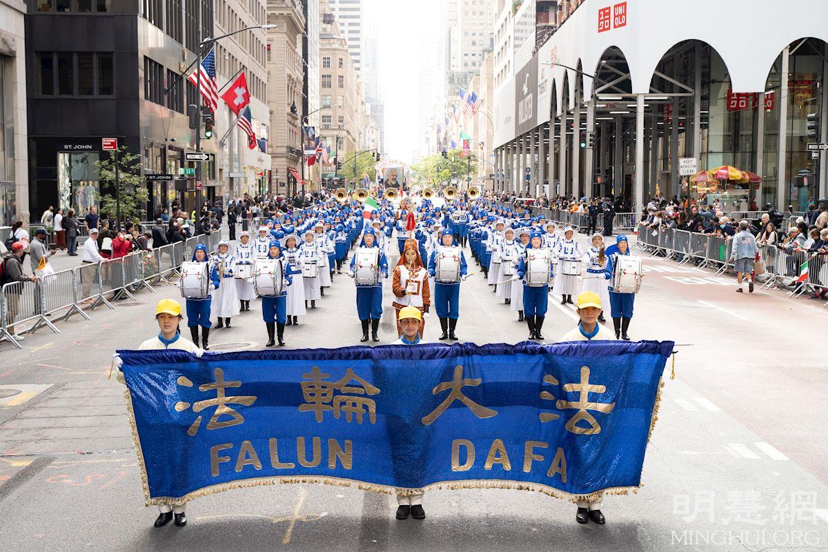 图20~22:二零二一年十月十一日,法轮功学员的天国乐团、旗阵、炼功队与腰鼓队参加了纽约第七十七届哥伦布日游行,在游行队伍中,非常亮眼。法轮功学员的演奏,鼓乐声声都传递着真、善、忍的信息,给观众留下深刻印象。观众纷纷表示法轮功队伍独特出众,非常棒,他们很喜欢。