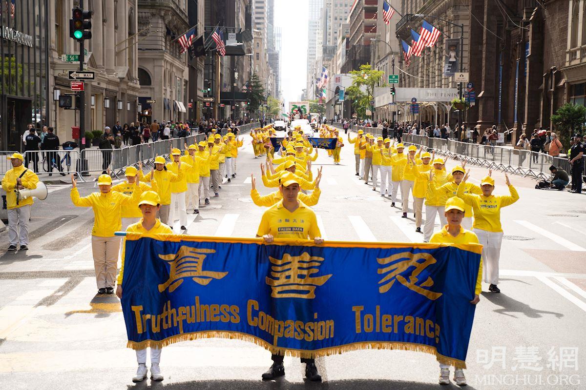 在许多游行中,活动主持人介绍法轮功队伍时,跟观众们介绍:法轮大法是以真、善、忍为准则的修炼方法,法轮功学员每天都在通过炼功和学法同化宇宙的特性。法轮大法使上亿人获得了心灵的净化,同时明白了生命的意义。